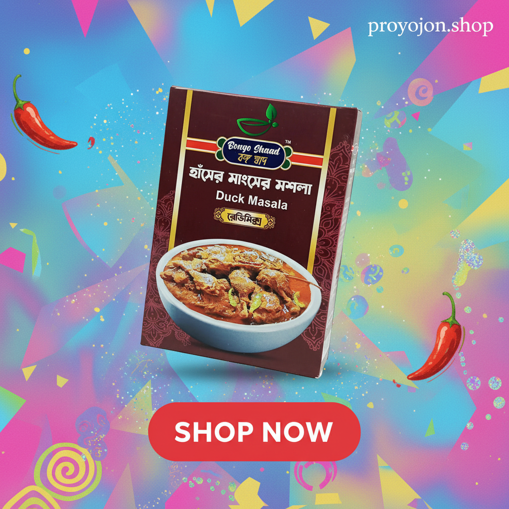 Bongo Shaad Duck Masala (40gm) is a spice blend designed to enhance the flavor of duck dishes, offering an authentic taste of Bengali cuisine. It's a premium product from the Bongo Shaad brand, known for its high-quality Bengali spices. This masala is crafted to provide a balanced and aromatic mix that complements the richness of duck meat, making it ideal for various preparations like curry, roast, and even rice dishes.