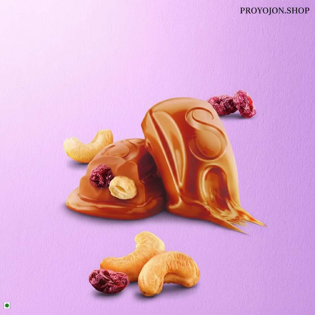Ingredients: Milk Chocolate (Sugar, Milk Solids, Cocoa Butter, Cocoa Solids, Emulsifiers), Nuts (Almonds, Cashews), Dried Fruits (Raisins), Permitted Flavors