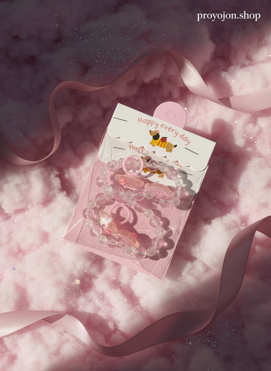 Delight your little one with this adorable sparkly pink bead jewelry set! Perfect for dress-up, parties, or everyday happy accessorizing, the stretch bracelets and matching charms provide instant fun and style. Great small gift idea.