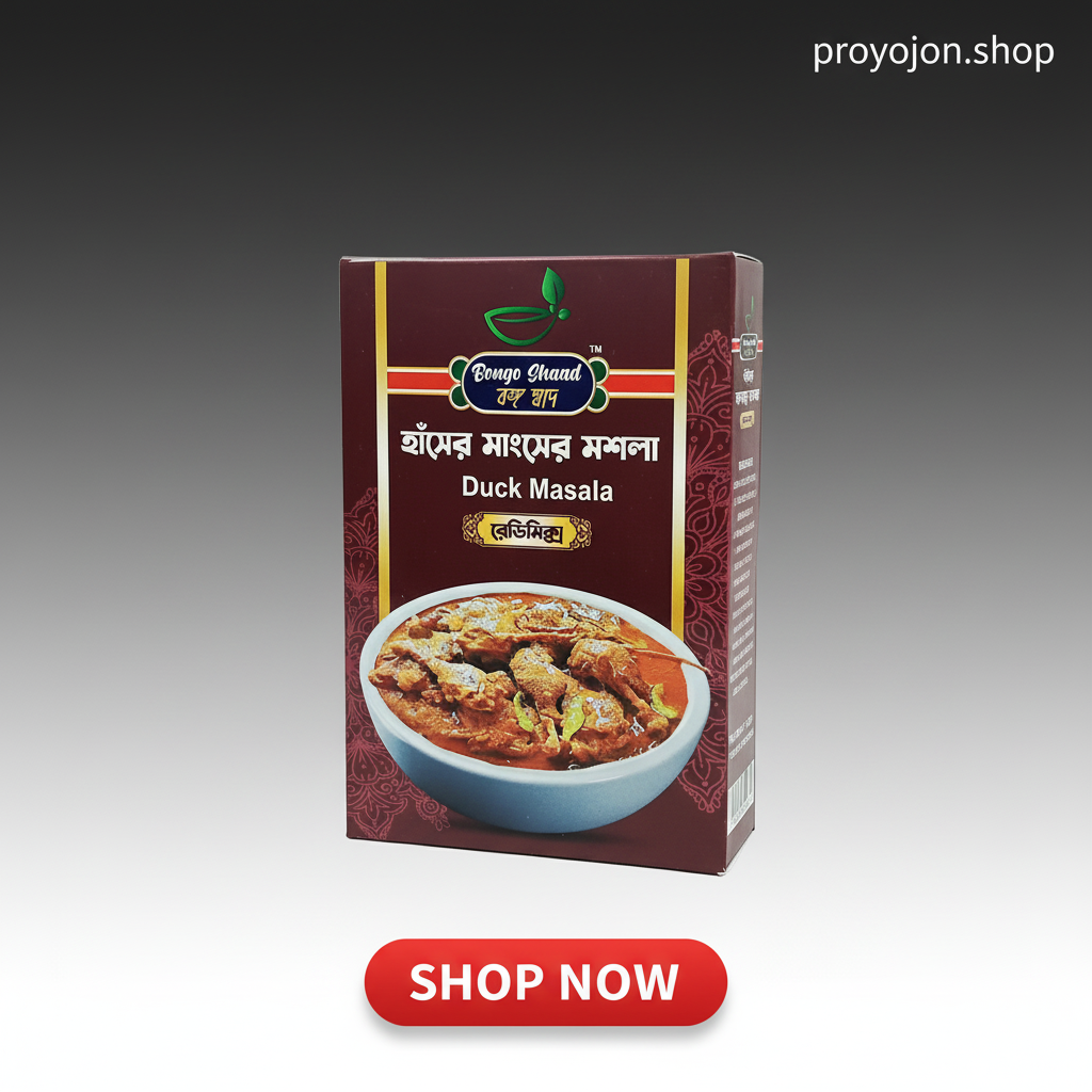 Bongo Shaad Duck Masala (40gm) is a spice blend designed to enhance the flavor of duck dishes, offering an authentic taste of Bengali cuisine. It's a premium product from the Bongo Shaad brand, known for its high-quality Bengali spices. This masala is crafted to provide a balanced and aromatic mix that complements the richness of duck meat, making it ideal for various preparations like curry, roast, and even rice dishes.