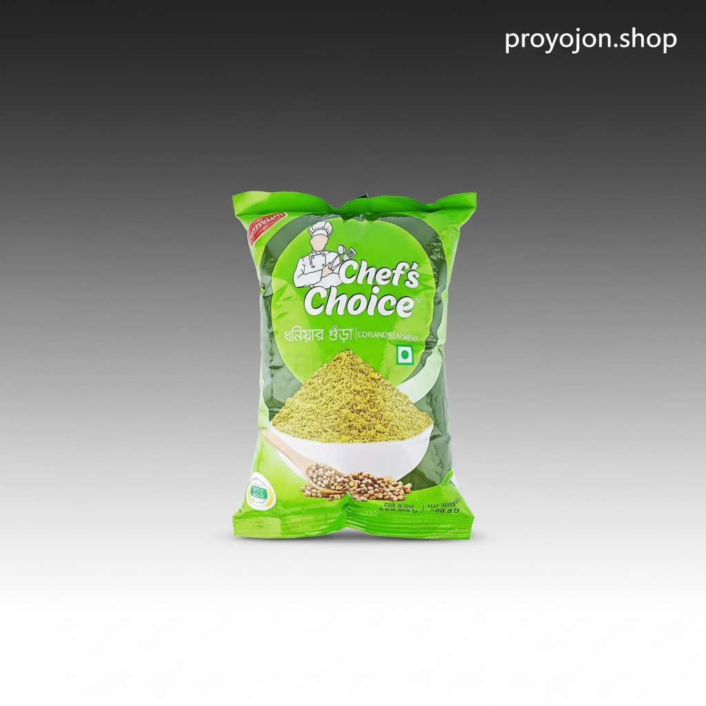 Chef's Choice Coriander Powder (ধনিয়া গুড়া) - 500g is a premium, finely ground spice widely used for its mild citrusy flavor and aromatic qualities in a variety of dishes. Here's an overview of the product: