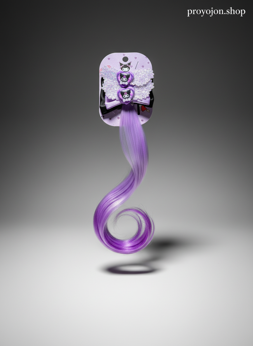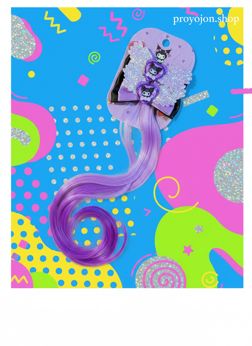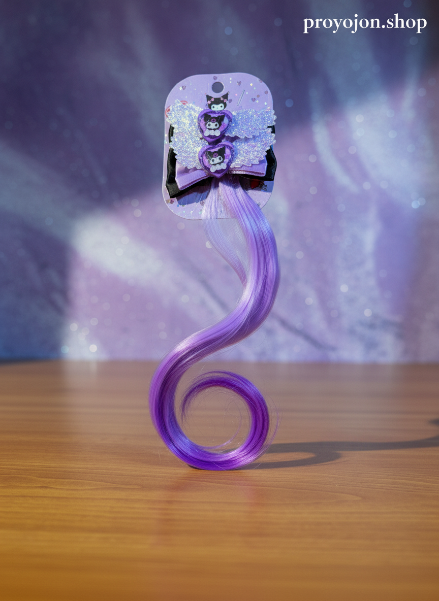 Instantly transform your look with this adorable Kuromi-themed hair extension clip. Featuring sparkly glitter wings and vibrant purple ombre hair, it adds a touch of playful, edgy charm to any hairstyle. Perfect for parties or daily fun!