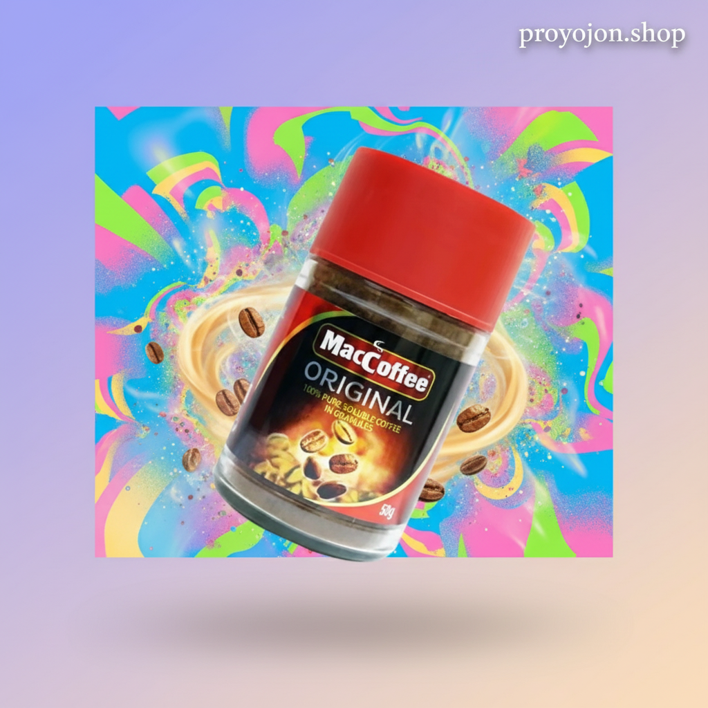 MacCoffee Original is a premium instant coffee crafted from 100% pure soluble granules, designed for those who appreciate authentic coffee flavor without the wait. Sourced from high-quality Arabica beans grown in Central and South America, this coffee delivers a smooth, aromatic taste with a pleasant lingering finish. Packaged in an airtight glass jar, it preserves freshness and aroma, making it ideal for home, office, or travel use.
